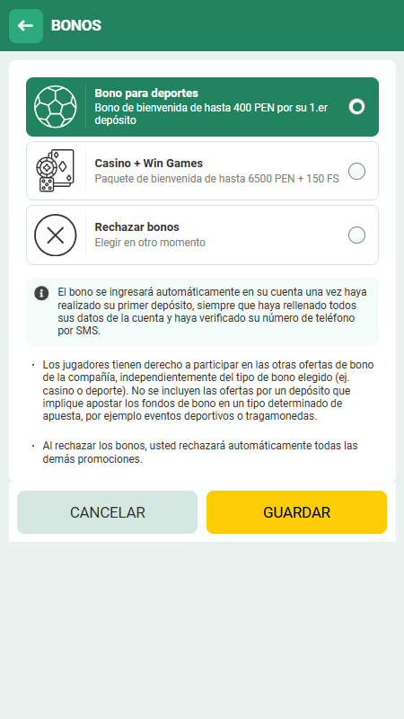 Selecciona uno de los bonos de bienvenida (casino o deportes).