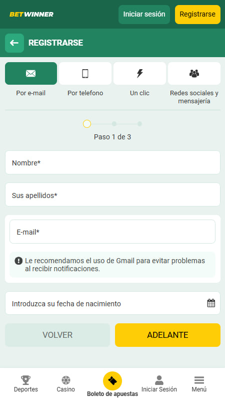 Ingresa al portal de BetWinner y pulsa el botón “Registrarse”.